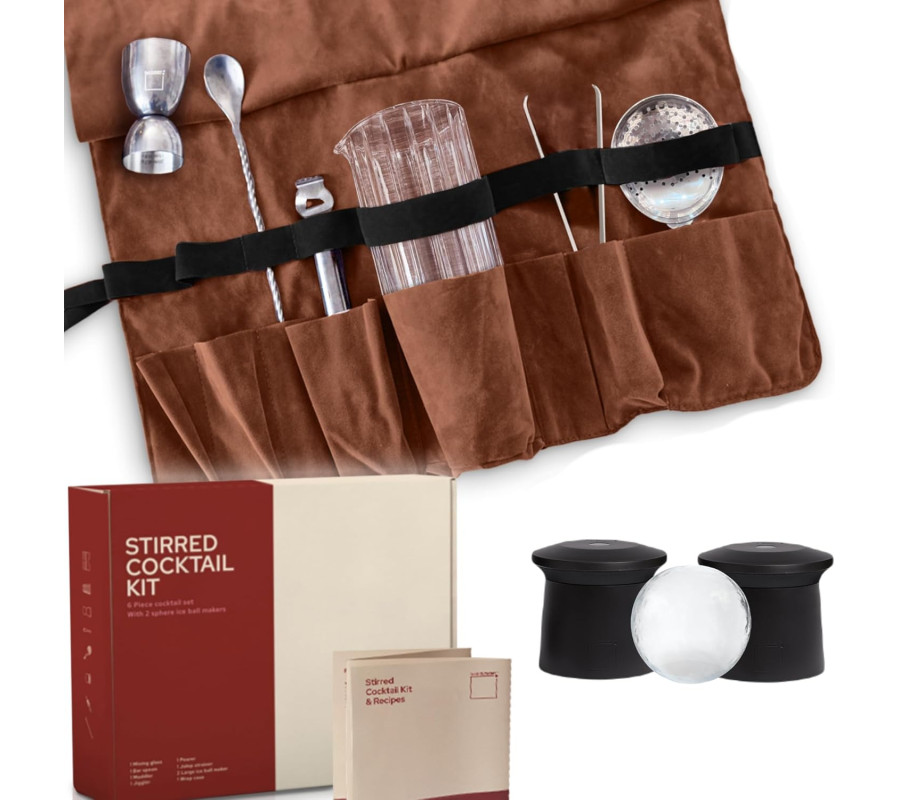 KOKTEIĻU PAGATAVOŠANAS KOMPLEKTS] Kokteiļu pagatavošanas komplektā ietilpst visi nepieciešamie bāra rīki kokteiļu pagatavošanai; bārmeņa maisīšanas glāze, 2 lieli ledus bumbiņu veidotāji, Julep sietiņš, divpusējs 30/60 ml maisītājs, kokteiļu maisīšanas karote, ledus knaibles.