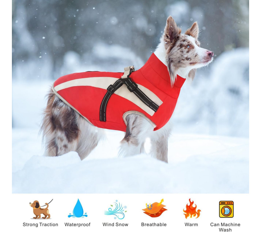 Ūdensnecaurlaidīgs suņu mētelītis ar iejūgu – silta ziemas jaka ar atstarojošām detaļām (sarkana, 4XL izmērs).