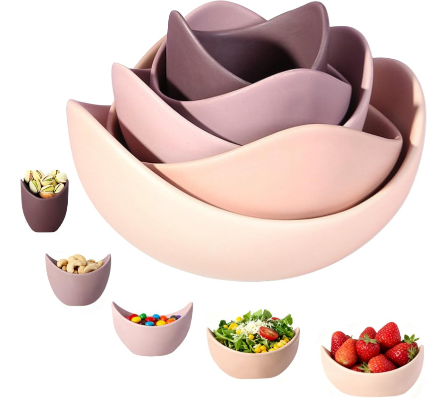 dažādu izmēru bļodas ar zieda iedvesmotu dizainu. Katrai bļodai