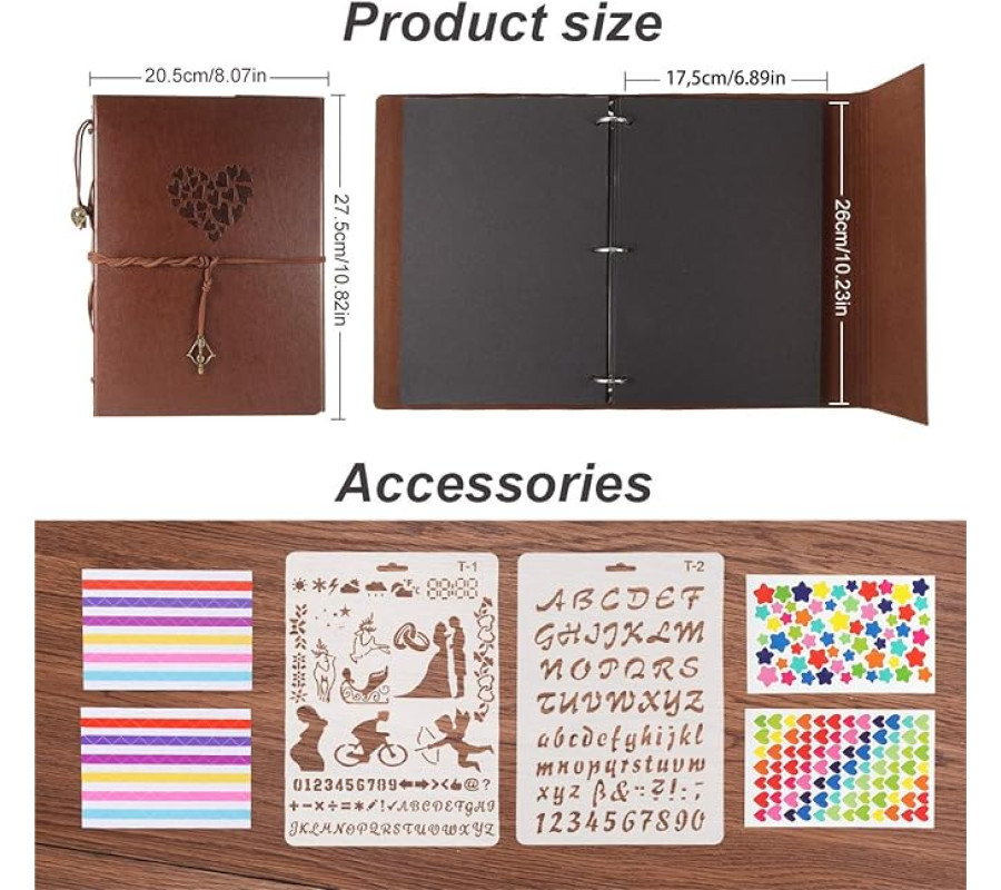 - Izmērs un ietilpība: albuma izmērs 27,5 x 20,5 cm. Tajā ir 30 melna papīra loksnes/60 lapas. Melnās lapas, kuru izmērs ir 26 x 17,5 cm (starp A5 un A4), ir lieliski piemērotas vairāk nekā 100 6 x 4 vai 7 x 5 collu fotoattēlu glabāšanai un atstāj vietu uz melnā papīra rakstīšanai.