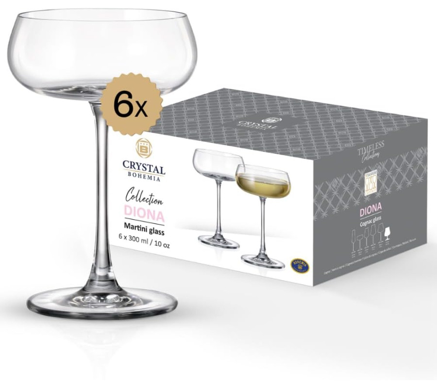 Crystal Bohemia kokteiļu glāzes, komplekts (6 gab.), katra 300 ml, piemērotas mazgāšanai trauku mazgājamajā mašīnā, izturīgas pret skrāpējumiem un ilgmūžīgas, greznas kristāla stikla glāzes – ideāli piemērotas kokteiļiem un stilīgiem pasākumiem.