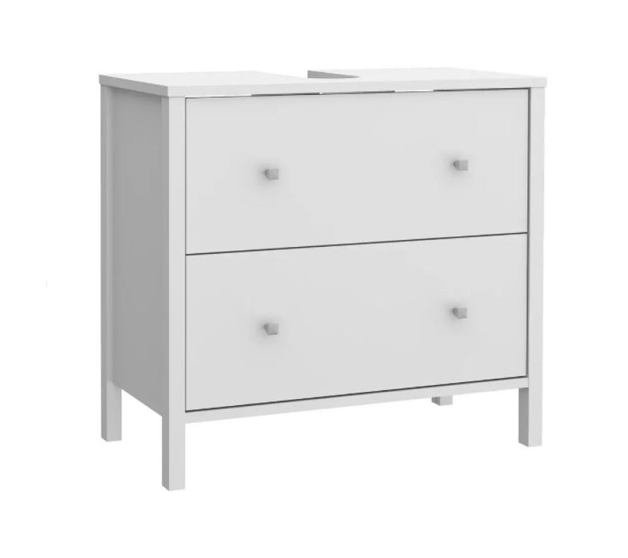 Šis modernais baltais vannas istabas skapītis ar vienkāršu dizainu, ideāli iederēsies jebkurā vannas istabā. Divas atvilktnes nodrošina plašu piederumu un vannas istabas tekstilizstrādājumu glabāšanas vietu. Rokturi piešķir stilīgu vizuālo akcentu.