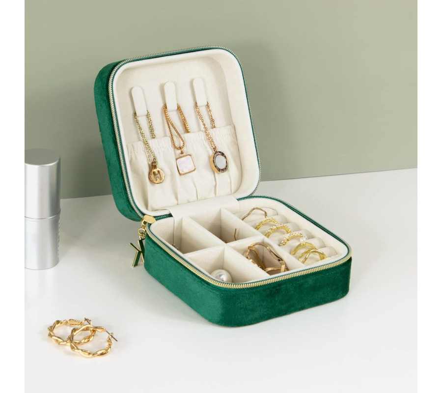 Ideāli piemērots ceļojumos,mājās, pārnēsājama samta plīša uzglabāšanas kaste auskariem, gredzeniem, kaklarotām, zaļa.