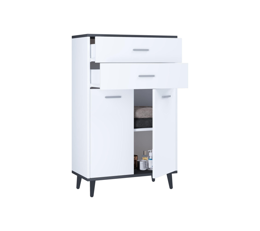 - Divas atvilktnes - Divas veramās durvis un divi nodalījumi - Praktisks plauktu sadalījums Divas atvilktnes un divi lieli plauktu nodalījumi piedāvā daudz vietas uzglabāšanai.