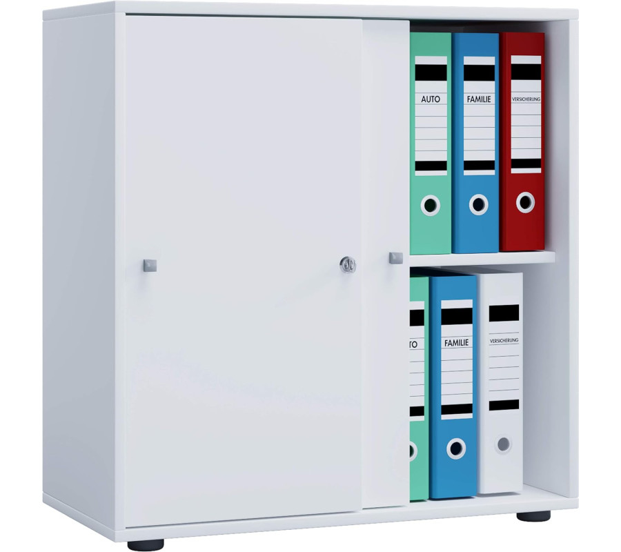 Biroja skapis ar bīdāmām durvīm un slēdzeni.