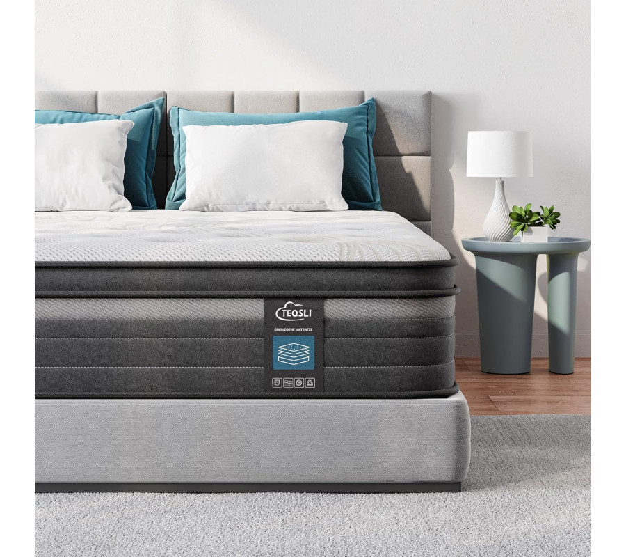 Ergonomisks un spiedienu mazinošs: TeQsli 9 zonu matracis 140 x 200 cm apvieno gēla memory putas un kabatu atsperes, lai perfekti pielāgotos jūsu ķermeņa kontūrām. Optimāls atbalsts un spiediena mazināšana palīdz izvairīties no muguras sāpēm. Augstas kvalitātes kabatu atsperes samazina kustību pārnesi un troksni, lai jūs varētu mierīgi gulēt – pat tad, kad jūsu partneris kustas. Pastiprinātās matraču malu atsperes nodrošina lielāku stabilitāti un drošību, iekāpjot un izkāpjot.