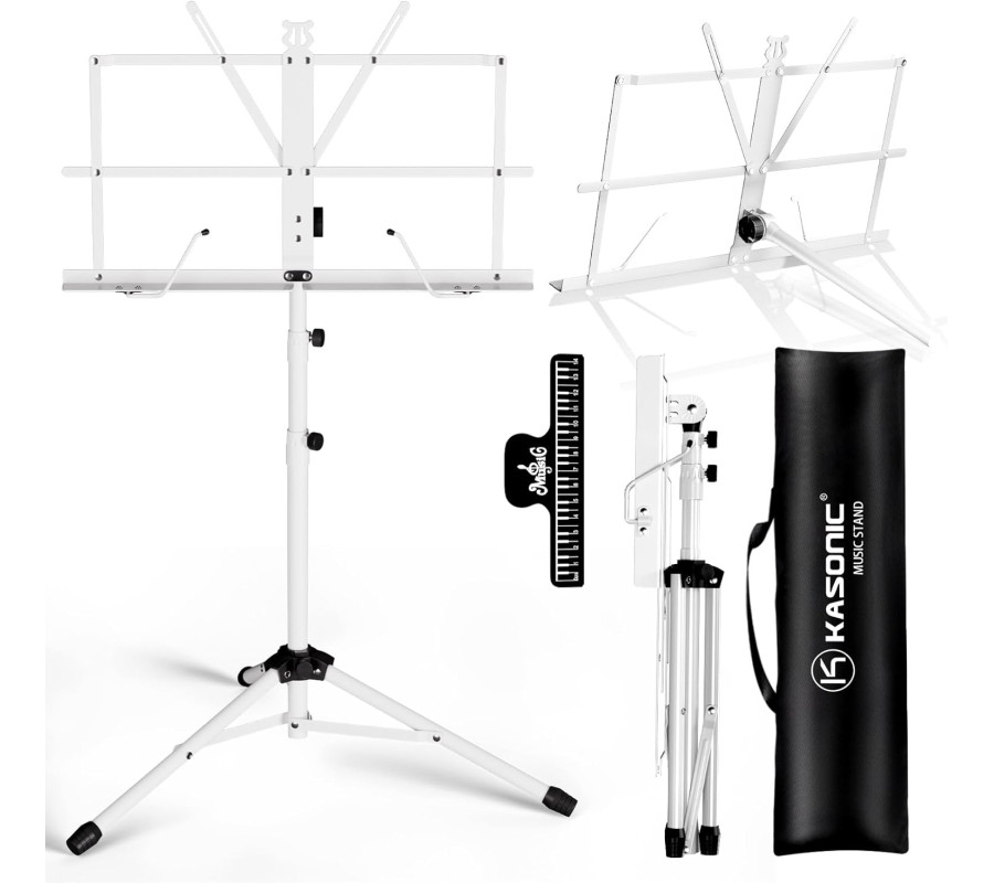 K KASONIC nošu statīvs 2 vienā — salokāms nošu un galda statīvs, pārnēsājams, viegls, ar nošu klipša turētāju un pārnēsāšanas somu, piemērots instrumentālam priekšnesumam, balts.