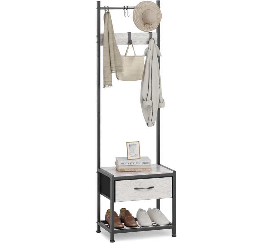 Vietu taupošs metāla drēbju pakaramais, 154 x 30 x 45 cm (augstums x dziļums x platums), melns/gaiši pelēks, koka tekstūra.