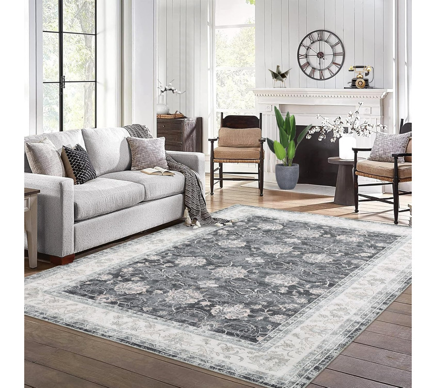 “WESTLOOM” paklājs ar vintage ziedu ornamentu – 120 x 170 cm, melns/pelēks.