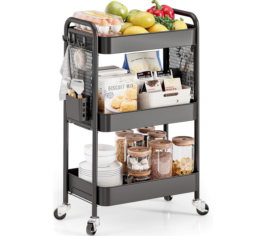 3 līmeņu ratiņi ar āķiem viesistabai, virtuvei, vannas istabai, birojam, melni.