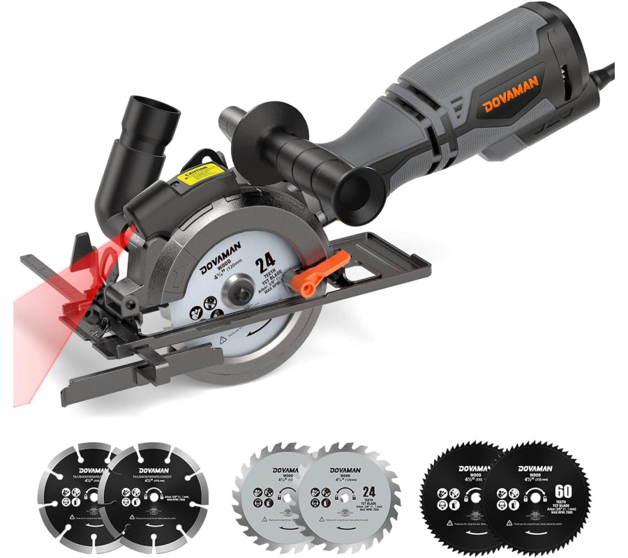 KOMPLEKTĀCIJĀ: DOVAMAN MCS01A portatīvais ripzāģis, 2 x 24 zobu 115 mm TCT asmeni kokam (viens iepriekš uzstādīts), 2 x 60 zobu 115 mm TCT asmeni metālam, 115 mm asmeni flīzēm, metāla palīgrokturi, malas vadotni, Vakuuma adapteris, 5 mm sešstūra atslēga, lietotāja rokasgrāmata.