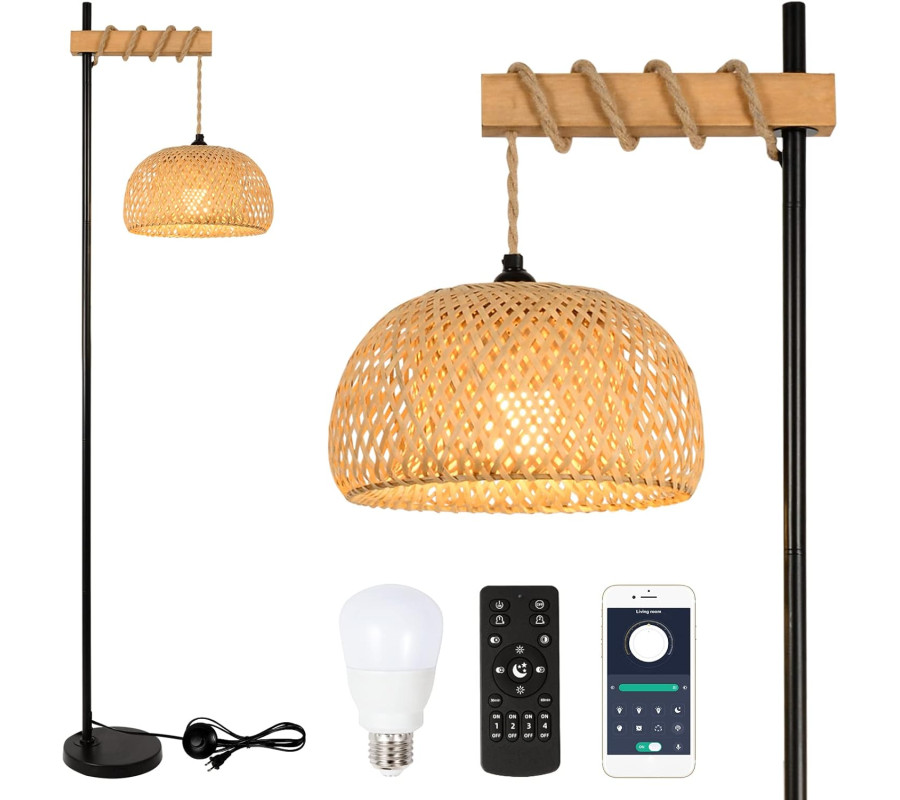 Lauku stila regulējama rotangpalmas stāvlampa ar viedo spuldzi, bambusa abažūrs, vadība ar lietotni, koka un melna metāla augsta lampa viesistabai, guļamistabai vai birojam, komplektā 9 W LED spuldze.